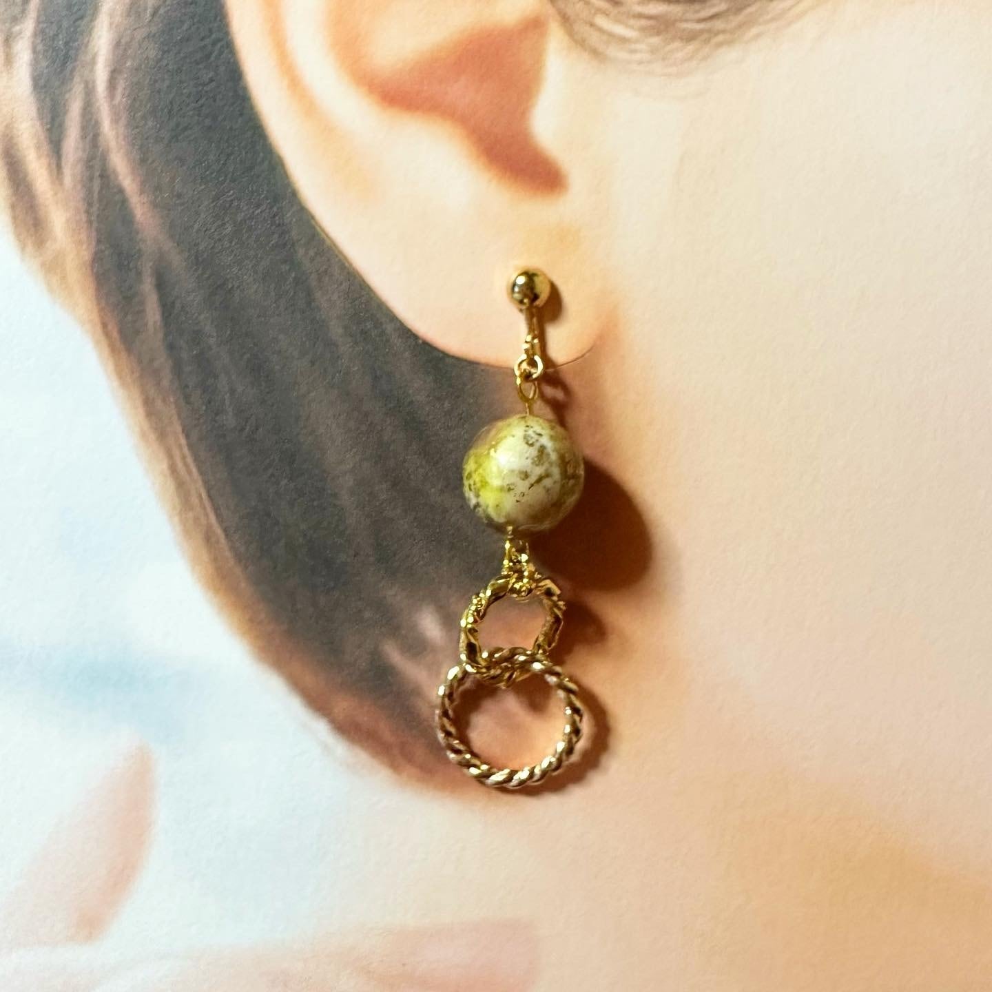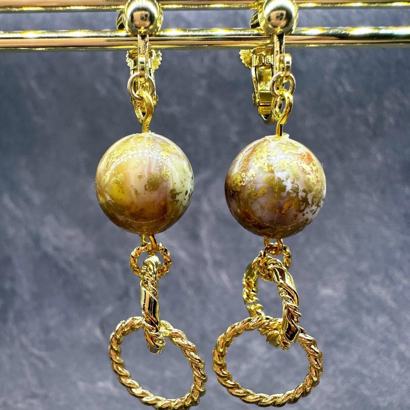 緑ベースに金や赤の箔が施されたドイツ製ビーズに、菩提樹の実とねじれパーツを合わせた和風な揺れるイヤリングです。