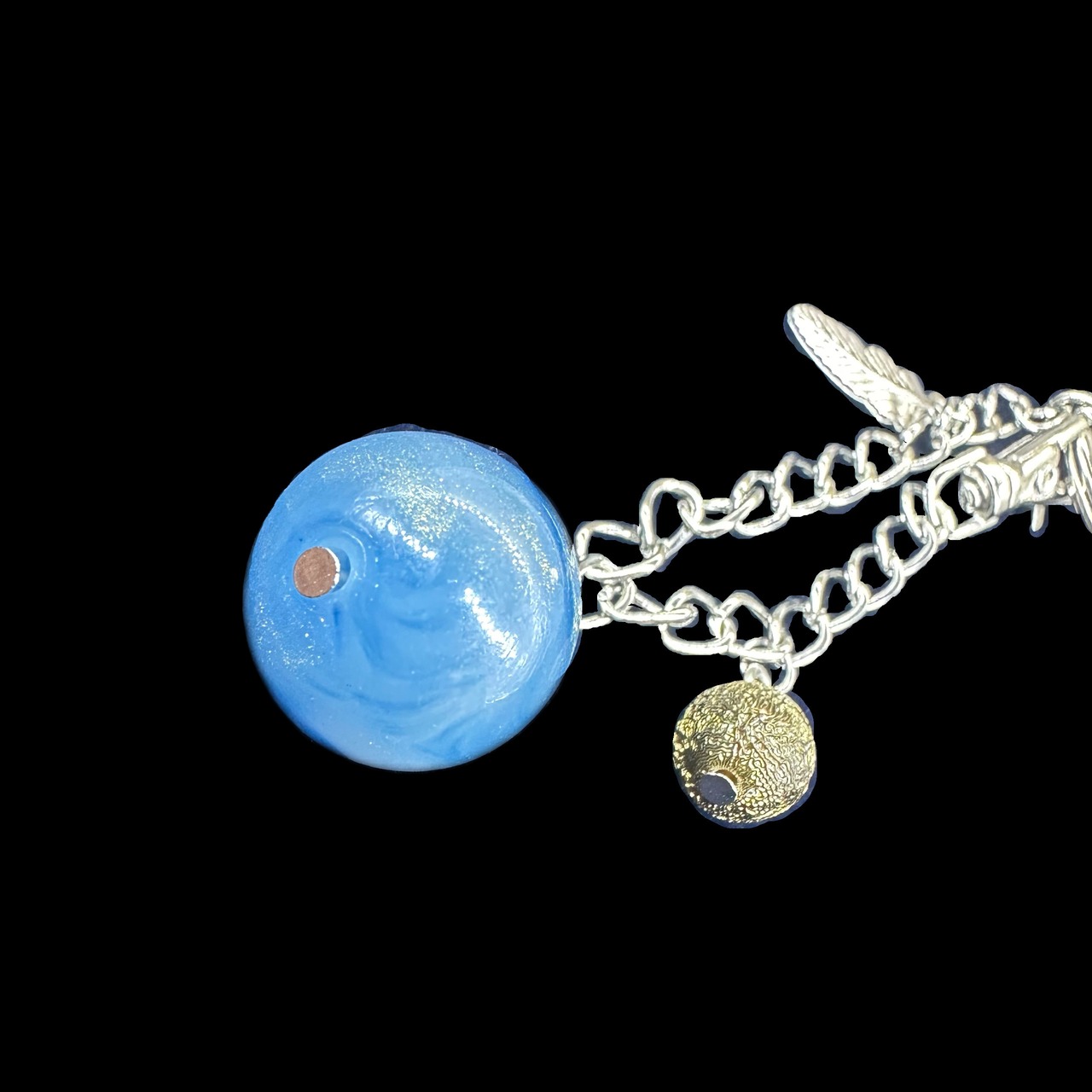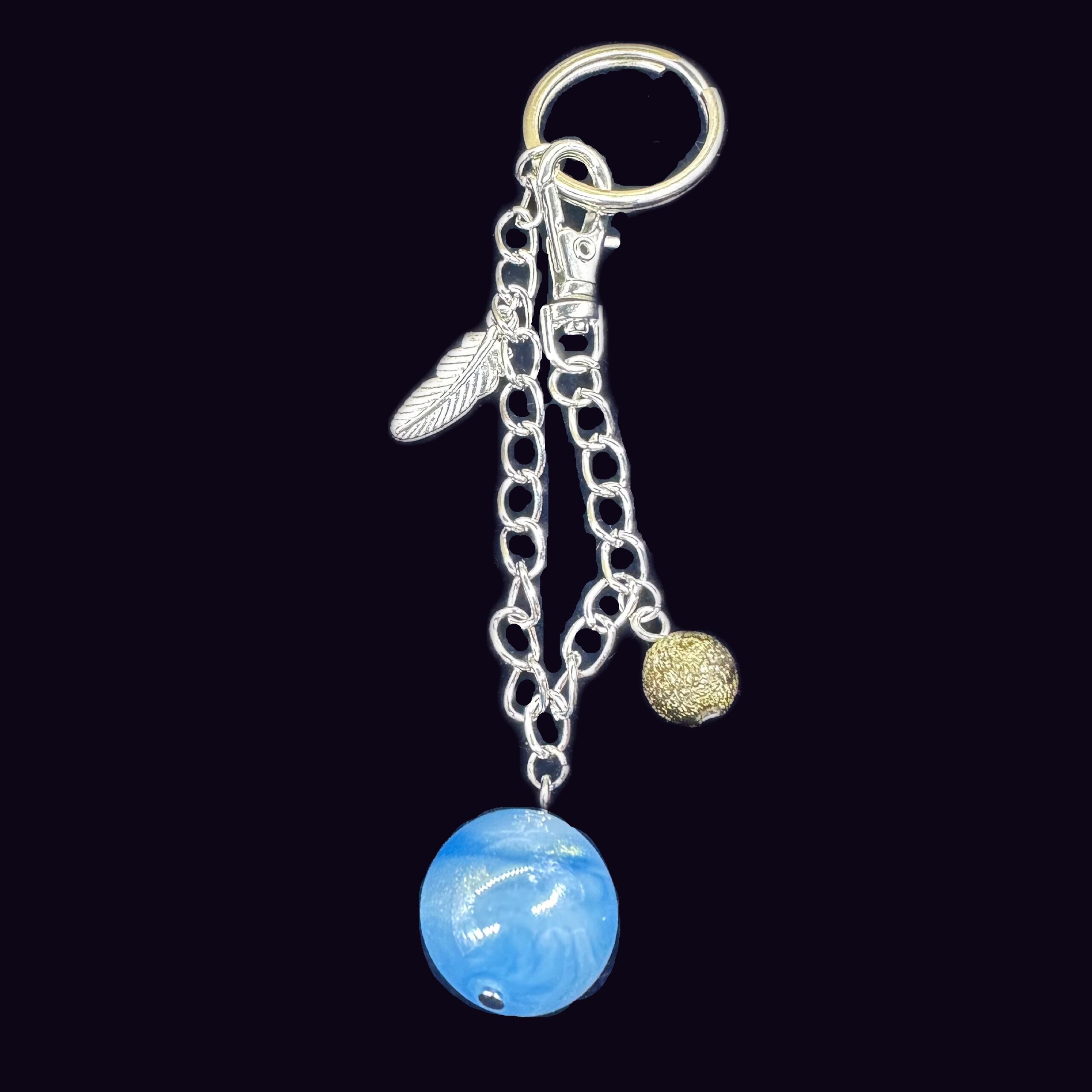 ブルーにゴールドラメのマーブル模様が入った大きめのビーズをメインに、シルバーでまとめたクールなバッグチャーム。
