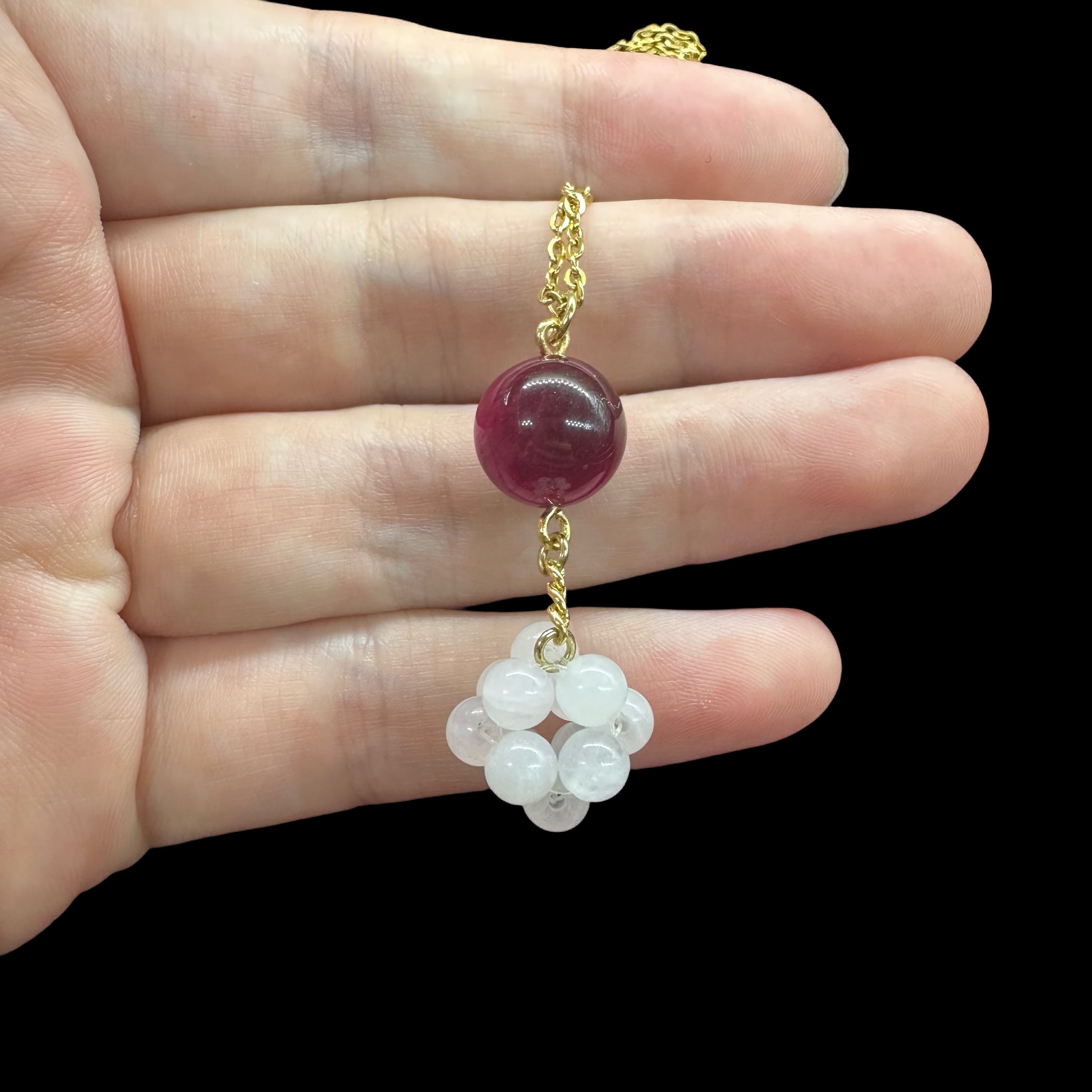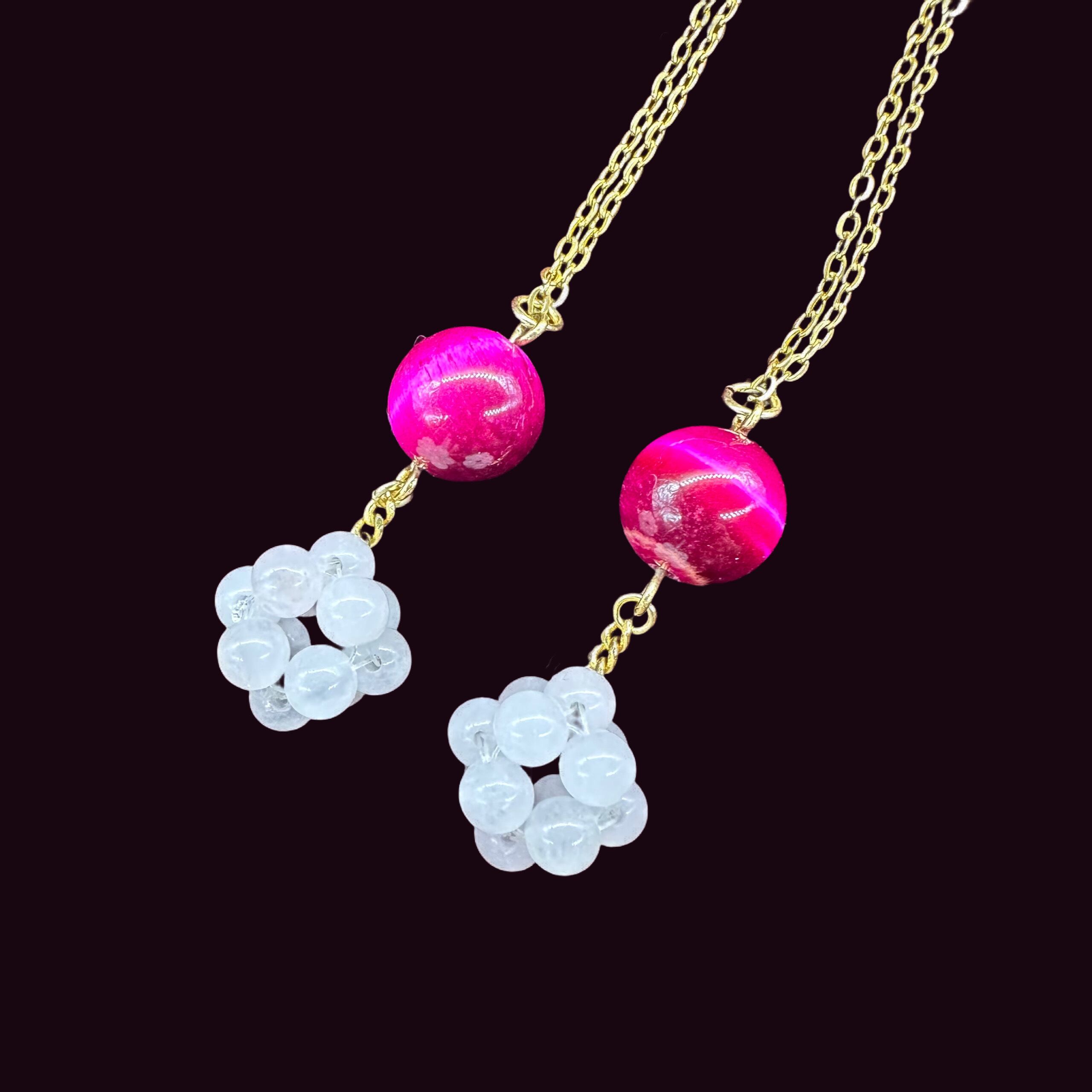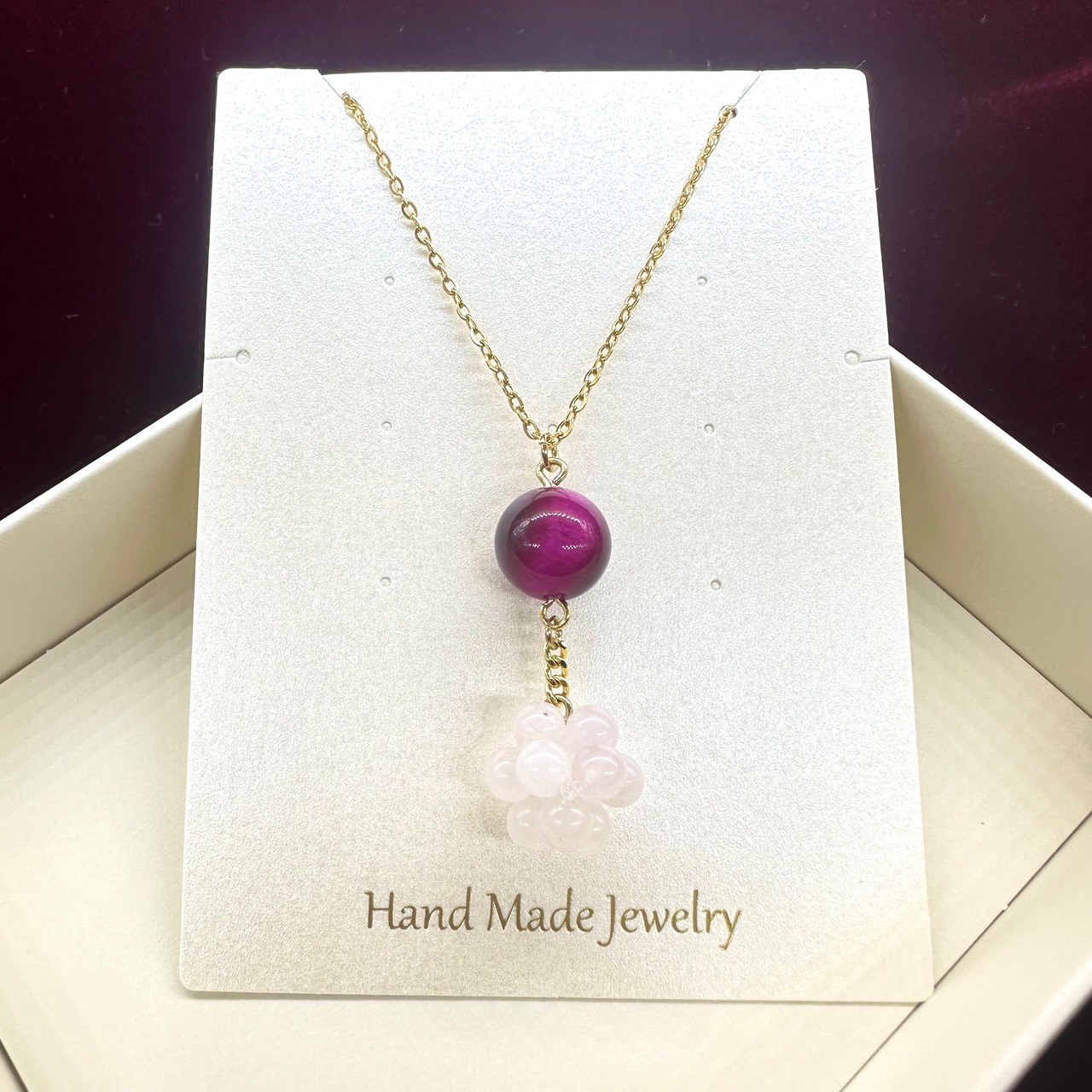 柔らかく温かみのある色合いのピンクタイガーアイと、優しいエネルギーを持つローズクォーツが組み合わさった、愛と癒しをもたらすペンダントです。
